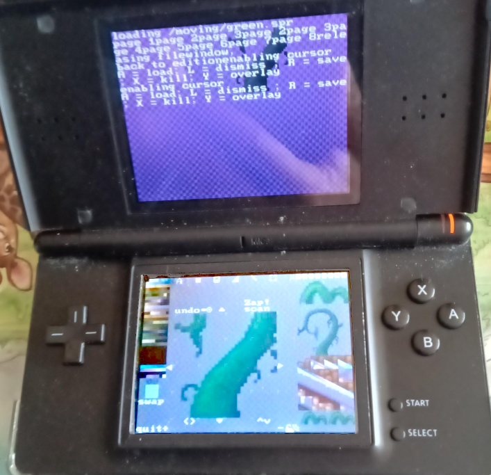 SpriteEditor for DS let you draw pixel art directly on your touch screen, supporting multiple pages, multiple palette, saving your work in dedicated .spr files, directly suited to NDS video memory format. More details on https://sylvainhb.blogspot.com/p/sprite-editor.html